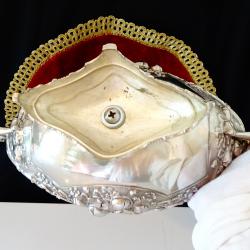 Посребрена медна жардениера, фруктиера, гондола, на столче, майсторска ръчна изработка от масивна мед, дебело посребрена с висока проба сребро, родирана за блясък и трайност. Декорирана с разкошни и много релефни рози, цветя и барокови орнаменти. Има две масивни барокови дръжки и стои стабилно на четири релефни крачета. Блести като огледало от вън и от вътре, идеална за ползване, декорация и подарък. Височина 16 см., дължина 33 см., ширина 16 см., тегло 1.1 кг.