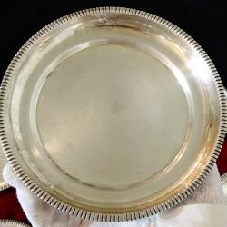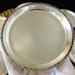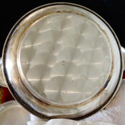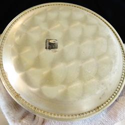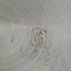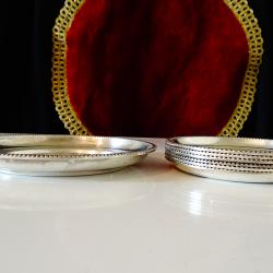 Стари чинии за хапки, гурме, купички, изработени от Alpaka/метална сплав от мед, никел и калай/, дебело посребрени с висока проба сребро. Имат печат DG Alpaka и запазен етикет, от който се разбира, че са патентован модел. Дъното на чинийките има сатенен ефект. Периферията е релефно декорирана в стил Art Deco. - малки чинии 6 броя – диаметър 10.5 см., височина 1 см., тегло на всяка 60 гр. - голяма чиния – диаметър 13.5 см., височина 1.5 см., тегло 100 гр. Цена за комплекта 29 лв.