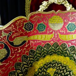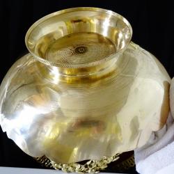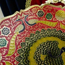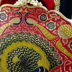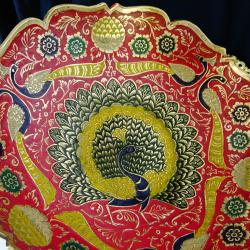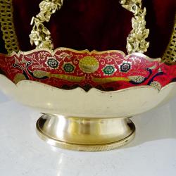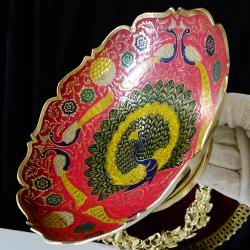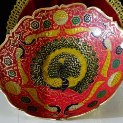Стара бронзова повдигната фруктиера, купа, съд за сервиране, майсторска ръчна изработка от масивен високо качествен бронз. Декорирана с прецизно изваяни релефни пауни, цветя и орнаменти. Фантастична картина с цветен клетъчен емайл, наситени багри и златен блясък. Височина 7.5 см., диаметър 21 см., тегло 330 гр.