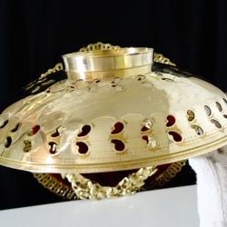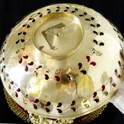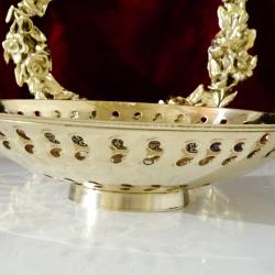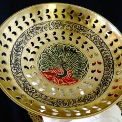 Стара повдигната фруктиера, съд за сервиране на дребни сладки, майсторска ръчна изработка от високо качествен бронз. Декорирана с релефно изображение на паун, красиви флорални орнаменти, цветен клетъчен емайл и ажур. Височина 4 см., диаметър 15 см., тегло 130 гр.