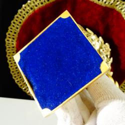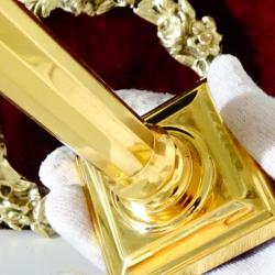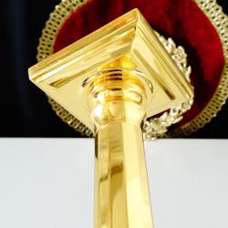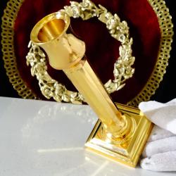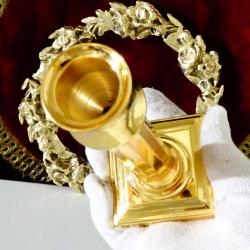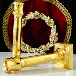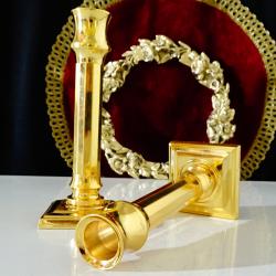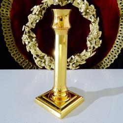 Разкощен свещник, майсторска ръчна изработка от свръх масивен бронз с дебела качествена позлата. Има сложен многостенен профил и блясък на златно кюлче. Стилен, ефектен, издържан в стил Art Deco. Основата има меко синьо кадифе. Височина 15.5 см., диагонал на основата 9 см., тегло на всеки 410 гр. Налични 2 броя, цена 46 лв., за брой.