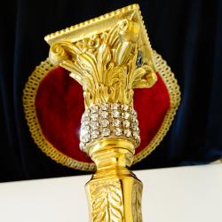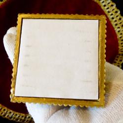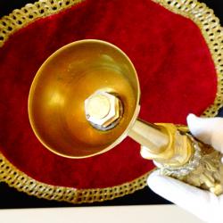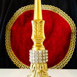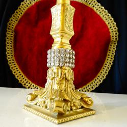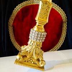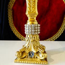 Стар немски свещник, майсторска ръчна изработка от масивен бронз, дебело позлатен с 24 карата злато. Основата на свещника е декорирана с най-красивите релефни барокови орнаменти, блестящи кристали и релефни лаврови клонки. Височина 24 см., диагонал на основата 9 см., тегло 500 гр.