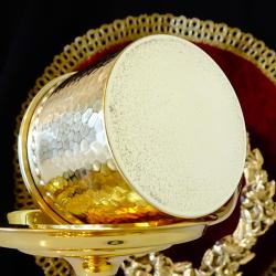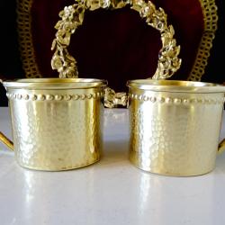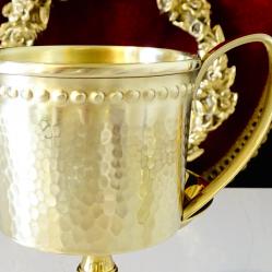 Стара чаша за кафе, чай, майсторска ръчна изработка от високо качествен месинг с дебела позлата. Кована с ефектна шарка пчелна пита и перлен релеф по периферията в стил Луи XVI. Височина 6 см., диаметър 7 см., тегло на всяка 60 гр. Вместимост 160 мл. Налични 2 броя, цена 8 € за брой.