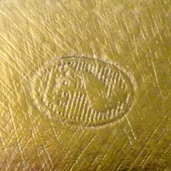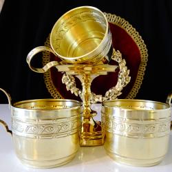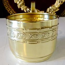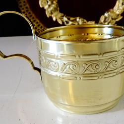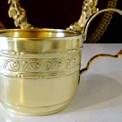 Стара чаша за кафе, чай, вода, майсторска ръчна изработка от високо качествен месинг с дебела позлата. Маркирана с печат на немската фабрика Metallwarenfabrik HA Jürst & Co., основана през 1847 г. в Берлин, била е придворен доставчик на кайзера. Съществува до 1925 г. Красиво декорирана с прецизно ковани орнаменти в стил Art Nouveau. Височина 7 см., диаметър 7 см., тегло на всяка 70 гр. Вместимост 160 мл. Налични 3 броя, цена 8.50 €, за брой.