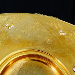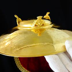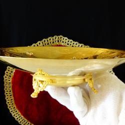 Стара немска фруктиера, купа, съд за сервиране, майсторска ръчна изработка от високо качествен як месинг, дебело позлатена с 24 карата злато. Има запазен етикет на производителя. Периферията е релефно декорирана с красиви флорални мотиви и орнаменти в стил Art Nouveau. Ефектно подчертани от блестящи кристали. Фруктиерата стои стабилно на три елегантни релефни крачета. Височина 6 см., диаметър 22 см., тегло 220 гр.