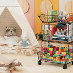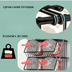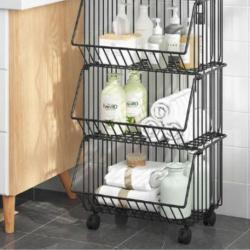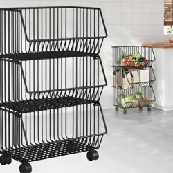 Материал: Неръждаема стомана; Размери на стелажа: 59 × 27 × 39 см; Размери на кошницата: приблизително 17 × 27 × 39 см; Нива: 3 броя, регулируеми; Колелца: Да, за лесно преместване; Поддръжка / почистване: Избърсване с влажна кърпа; без агресивни препарати; Допълнителни функции: Модулен дизайн, отворени кошници, пестящ място.