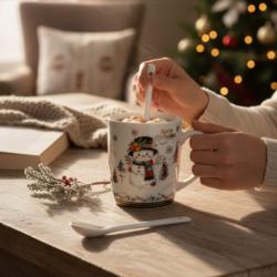 Технически характеристики Материали: Керамична чаша и керамична лъжичка Вместимост: ~180 ml Размер на чашата: 7.5 × Ø7 см Мотиви: Дядо Коледа, снежен човек, еленче или пингвин Надпис: Merry Christmas Размер на кутията: 13 × 14 × 8 cm Безопасност: Изработена от висококачествена керамика, подходяща за топли напитки Опаковка: Подаръчна кутия с прозорче и дръжки Подходящо за деца: Да – безопасни, устойчиви материали