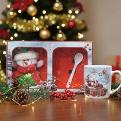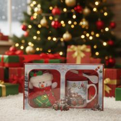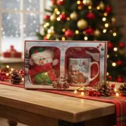 Технически характеристики Материали: керамика (чашата), текстил и плюш (играчката), пластмаса (лъжичката); Обем на чашата: около 320мл; Размери: стандартна чаша; играчка ~15–20 см (според варианта); Цветове: коледни мотиви – червено, зелено, бяло, златно; Безопасност: подходящо за деца; чашата е предназначена за топли напитки; Допълнителни елементи: декоративна кутия, лъжичка, плюшен снежен човек; Подходящ за: подарък, офис, дом, училище, елха; Опаковка: луксозна подаръчна кутия.