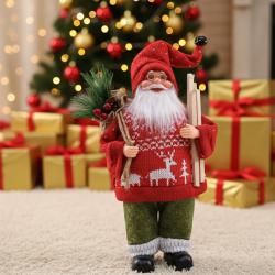 Технически характеристики Материали: пластмаса + текстил; Размери: дължина 17 cm, ширина 10 cm, височина 30 cm; Цвят: червен, зелен, бяло; Тегло: 200 g; Светлини: няма; Батерии: не са необходими; Допълнителни елементи: дървени ски, борова клонка, декоративни плодчета, плетена шапка и пуловер; Безопасност: подходяща за дом с деца; без остри ръбове; Подходяща за: елха, маса, камина, рафт, офис, коледен кът; Опаковка: защитна, подходяща за подарък.