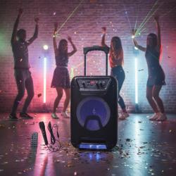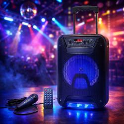 Материал / корпус: твърд корпус с предна решетка, телескопична дръжка за пренасяне; Размери / тегло: 26 × 22 × 42 см; нето: 2,8 кг, бруто: 3,5 кг; Мощност / батерия: обозначенията по продукта/описанието варират — срещат се изходна мощност 10 W и RMS 20 W; време за възпроизвеждане 2–3 часа (спрямо сила на звука); – Батерия: вградена презареждаема батерия 3.7V; зареждане DC 5V; Свързване / съвместимост: Bluetooth 5.0 + EDR (A2DP), обхват до 10 м; USB, TF (карта памет), AUX IN, FM, MIC, TWS; Допълнителни функции: LED светлина, дистанционно управление; Гаранция: 12 месеца.
