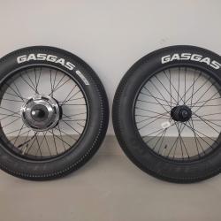 Комплект нови капли за фет байк GASGAS BAFANG 20 цола, нови алуминиеви усилени капли за фет байк 20 цола, алуминиеви главини, задна главина електрически мотор BAFANG 250 вата с главина на шлици за 7-8-9-10 венеца, главини за дискови спирачки с 6 болта, емайлирани черни спици, каплите са в комплект с външни и вътрешни гуми 20 х 4 със спортен грайфер, общо тегло 11 кг.