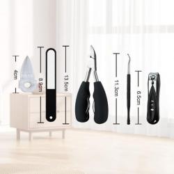 Тип уред: Ръчен комплект за поддръжка на нокти; Захранване: Не се изисква; Материали / корпус: Неръждаема стомана, ергономични неплъзгащи се дръжки; Брой инструменти: 5; Комплектът включва: клещи за нокти, инструмент за кожички, пила, нокторезачка, помощен инструмент; Поддръжка: Лесно почистване, без специални изисквания; Предназначение: Поддържане на външния вид, лична хигиена, домашна и пътна употреба; Безопасност: Стабилен захват, прецизно рязане без приплъзване.