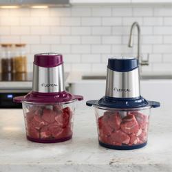 Вид уред: Електрически чопър; Мощност: 400 W; Напрежение: 220–240 V ~ 50/60 Hz; Обем / вместимост: 3 литра; Режими: 2 скорости на рязане; Ножове: 4 ножа от неръждаема стомана, сваляеми; Цветове: син, лилав; Материали / корпус: Неръждаема стомана + стъклена купа; Основа: Неплъзгаща се; Батерия: Не използва батерии – работи директно с електрическа мрежа; Приложение: готвене, бърза подготовка на продукти, поддържане на кухнята.