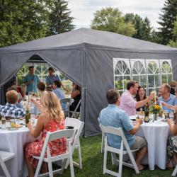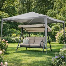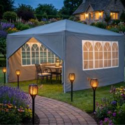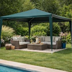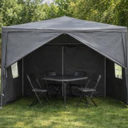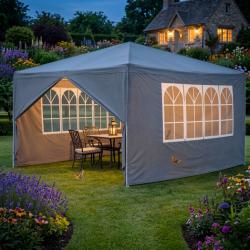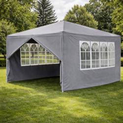 Технически характеристики на Просторна градинска шатра - стабилна конструкция и водоустойчива рамка Техническите параметри гарантират надеждност и ясно очертават възможностите на продукта: Размери: дължина 4 м, ширина 3 м. Цвят: сив и зелен Материал на покритието: полиетилен (PE), тегло 90 г/м², водоустойчив. Конструкция: стомана (желязо) с крака 24 × 24 мм, горни тръби 18 × 18 мм; дебелина на стената на тръбата 0,45 мм. Странични стени: 2 стени с по четири прозореца и 2 плътни стени с ципове. Приложение: градина, парцел, тераса, барбекюта, партита и събития на открито.