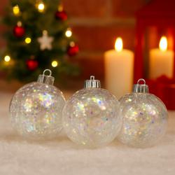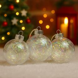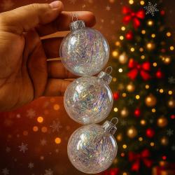 Уморена ли си всяка година елхата да изглежда „като миналата“ – еднообразна, без блясък и настроение? Тези прозрачни коледни топки с преливащ ефект решават проблема мигновено. Те улавят светлината от лампичките и я разпръскват в нежни цветове, които създават усещане за топлина, уют и празничен разкош. Материал: висококачествена прозрачна пластмаса (PVC); Брой в комплекта: 3 броя; Диаметър: приблизително Ø6–7 см; Цвят: прозрачен с пълнеж с преливащ ефект (блестящи нишки); Опаковка: червена празнична лента с надпис „Merry Christmas“; Употреба: за вътрешна декорация – коледно дърво, венци, гирлянди, централни аранжировки;