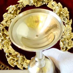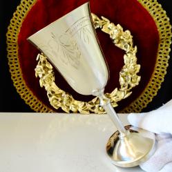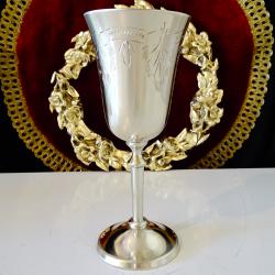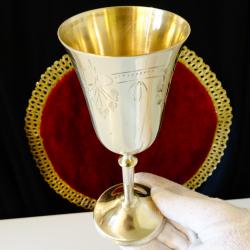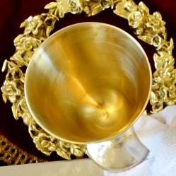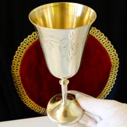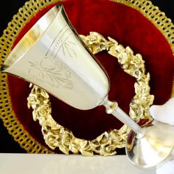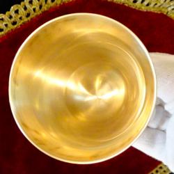 Стара чаша на високо столче, бокал за вино, шампанско, майсторска ръчна изработка от масивен, високо качествен бронз. Декорирана с ръчно гравирани релефни барокови орнаменти, чашата блести като златно огледало и звъни като празнична камбанка. Височина 15.5 см., диаметър 6.5 см., тегло 170 гр. Вместимост 160 мл.