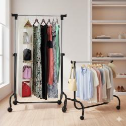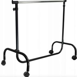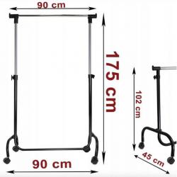 Размери: ширина 90 см, дълбочина 45 см, височина регулируема 102–175 см; Материал: стомана (хромирани и прахово боядисани елементи) + PP (полипропилен) съединения; Диаметър на тръбите: хромирани ø22 мм; черни ø26 мм (корекция: милиметри, не сантиметри); Колелца: 4 бр., въртящи се; Цвят: черен/сребрист; Употреба: дом, офис, магазин, хотел; подходяща и като временен щендер или стойка за сушене.