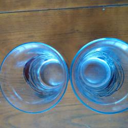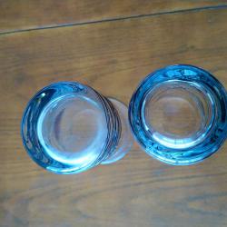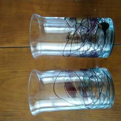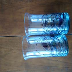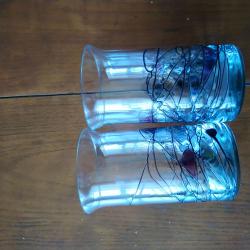 Релефни стъклени чаши с цветни елементи. Произход неизвестен около 1995 г. Размери ф60*115*ф70 мм..Чашите не са използвани.