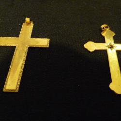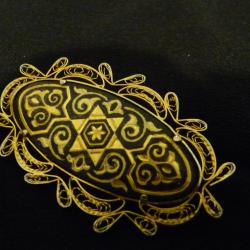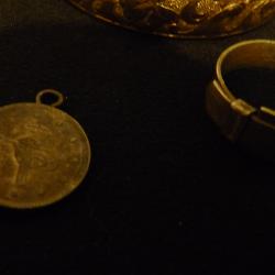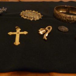 Бижута на 90 и повече години, а някои и повече: 1/. Цвете със синтетичен аквамарин - 60мм. Цена 22 лв. 2/. Брошка от Франция - 50мм. Цена - 22 лв. 3/. Кръст с размер 50х32мм. позлатено. Цена -26 лв. 4/. Кръст с размер 53х32 мм., американско дубле /позлатено/. - цена 26 лв. 5/. Брошка - Франция - 40 мм. Цена - 26 лв. 6/. Арабска монена за закачане на синджир - цена - 26 лв. 7/. Пръстен с надпис МАКЕДОНИЯ на повече от 100 години, Фи 24мм. Цена 106лв. /антика/. 8/. Халка с надпис Югославия, фи19мм. Цена - 26 лв. 9/. Стара дамска гривна - позлатена от "американско дубле", декорация с цветя. Гривната е стара, но без ремонти по нея. Вътрешен размер - 67 мм. Цена - 106 лв. Изпращам по СПИДИ с преглед.