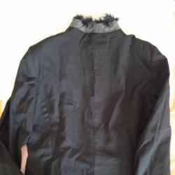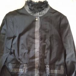 Сакото от висококачествена тънка вълнена тъкан (virgin wool), с подплата. Цвятът е наситен черен (не е сив). Яката на сакото е обработена с тънък косъм. Кратко време се носено. Състоянието е здраво, без забележи. Изпрано, чисто е, готово за употреба. Гръдната обиколка 98 см Талията 88 см Обиколката на ханша 98 см Дължина по гърба 55 см Доставка Спиди, Еконт или лично.