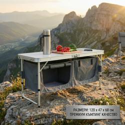 Технически характеристики на Сгъваем къмпинг шкаф – компактен, здрав и идеален за перфектен ред на открито Размери в разгънато състояние: 120 x 47 x 68 см Размери в сгънато състояние: 60 x 47 x 10,5 см Материали: MDF плоскост + алуминиева рамка Диаметри на тръбите: 25 мм / 23 мм / 19 мм Дебелина на тръбата: 0,8 мм Максимална товароносимост: 20 кг Тегло и мобилност: лек за носене, но стабилен при ползване на открито Категория: къмпинг мебели, сгъваем шкаф, къмпинг оборудване, outdoor kitchen