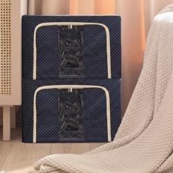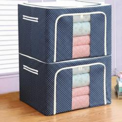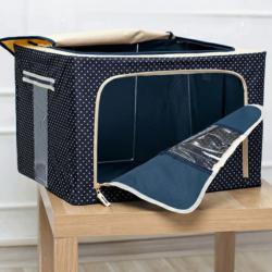Технически характеристики на Сгъваема кутия за съхранение за подреден дом За по-технически ориентираните потребители ето точните данни, на които можете да разчитате: Капацитет: 66 литра Размери: 52.5 x 42 x 30 cm Материал: 70% полиестер (Оксфорд), 20% фазер със средна плътност, 10% стоманена рамка Цвят: син с бели точки Особености: влагоустойчиво покритие, прозрачни прозорчета, двойни ципове, дръжки, сгъваем механизъм