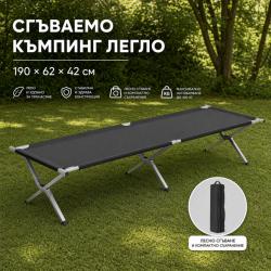 Технически характеристики на Сгъваемо къмпинг легло XXL – Здраво, компактно и удобно за сън навсякъде Размери: 190 × 62 × 42 см Максимално натоварване: 100 кг Цвят: Черен Рамка: Желязо + PP елементи Материал: 600D плат (устойчив на външни условия) Калъф: Да, с дръжка за носене Тегло: приблизително 5 кг Конструкция: Сгъваема, бързо разгъване