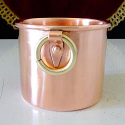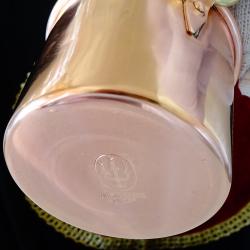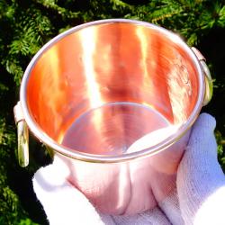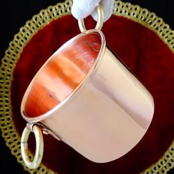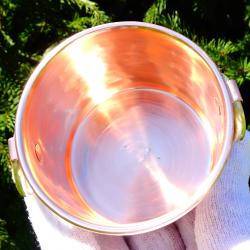 Стара шведска медна чаша, майсторска ръчна изработка от масивна чиста червена мед с ослепителен блясък от вън и от вътре. Маркирана с релефен печат на производителя Ahrnebergs Sweden, датира от 1960 година. Има масивни бронзови дръжки, халки, стабилно захванати за съда с дебели медни нитове. Вечна чаша с безупречно шведско качество. От вътре не е калайдисана, подходяща за вино, чай, медна вода. Височина 5.5 см., диаметър 7 см., тегло 90 гр. Вместимост 200 мл.