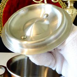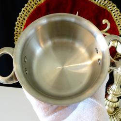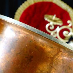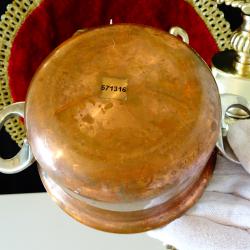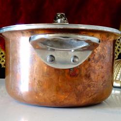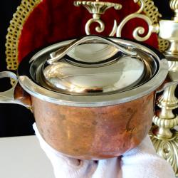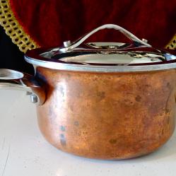 Стара медна тенджера изработена от шведската фабрика Patina, която предоставя на професионалните ресторантьори качествени аксесоари от 2002 година. Изработена по сложна технология от три слоя различни метали – мед, алуминий и неръждаема стомана, тенджерата има висока и равномерна топлопроводимост без да загаря. Капака е със специален релеф, така че да затваря плътно и да има ефекта на съдовете Цептер. Уникален съд подходящ за сосове, чай, мляко, затопляне, сервиране и др. Тенджерката не е ползвана, практически нова със запазен етикет на дъното. Височина 8.5 см., диаметър 11.5 см., дължина с дръжките 17 см., тегло 500 гр. Вместимост 450 мл.
