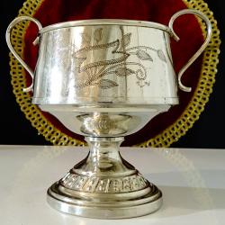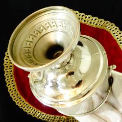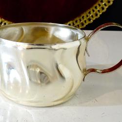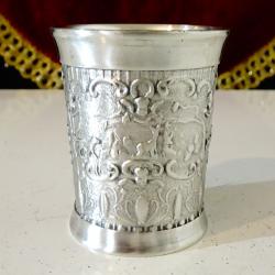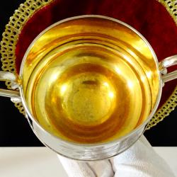 Стара шведска чаша за вино, майсторска ръчна изработка от високо качествен месинг. От вън е дебело посребрена с висока проба сребро, родирана за блясък и трайност. От вътре е позлатена с 24 карата злато. Декорирана с релефно гравирани флорални мотиви, чашата стои стабилно на ефектно столче. Има две извити дръжки за звънки наздравици. Височина 12.5 см., диаметър 10 см., тегло 160 гр. Вместимост 250 мл.