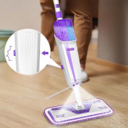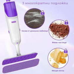 Тип: Спрей моп с двоен резервоар Капацитет на бутилките: 2 × 310 мл (общо 620 мл) Материал на дръжката: Алуминий Въртене на главата: 360° Спрей механизъм: Чувствителен спусък с равномерна фина мъгла Подложки: 3 броя, многократни, подходящи за пране Подходящ за: твърда дървесина, ламинат, цимент, камък, стъкло, бамбук Тегло: лек и удобен за ежедневна употреба Размери: стандартни за домашно почистване