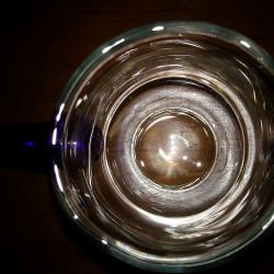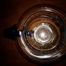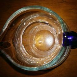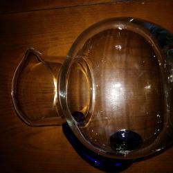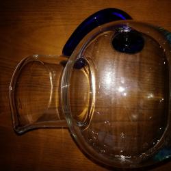 Стъклена кана със синя дръжка. Произход България около 1995 г. Габаритни размери на каната 200*140*175 мм..Диаметър на основата ф76 мм..Диаметър на най-широката част ф140 мм..Размери на гърлото 100*86 мм..Каната не е използвана.