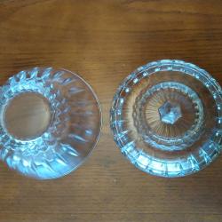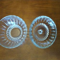 Стъклена захарница или кутия за дребни бонбони. Произход неизвестен около 1995 г. Размери на захарницата ф60*95*ф120 мм..Захарницата не е използвана.