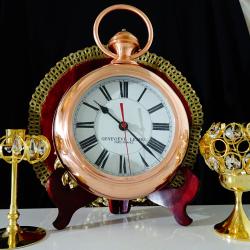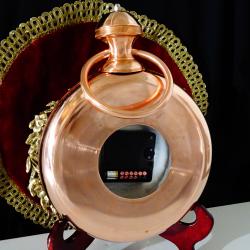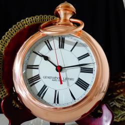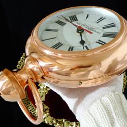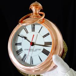 Стенен часовник на световно известната френска марка Genevieve Lethu, създадена от Ла Рошел през 1970 г. Пътешествията са в основата на дизайна на повечето им колекции. Корпуса на часовника е изработен от високо качествена чиста червена мед с ослепителен огнен блясък и ефектен дизайн на джобен часовник. Стъклото е безупречно. Циферблата е с римски цифри. Работи перфектно и точно с кварцов механизъм на Junghans. Височина 30 см., диаметър 21 см., диаметър на циферблата 15 см., тегло 700 гр. Изключителна находка за любители и колекционери – смея да твърдя, че в момента е единствен в света.