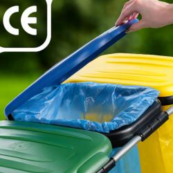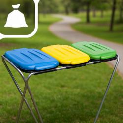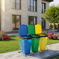 Размери: ширина 98 см, дълбочина 36 см, височина 74 см. Капацитет: подходяща за 120-литрови торби. Материали: рамка от поцинкована стомана; капаци от устойчива пластмаса, устойчива на влага и замърсявания. Система: три отделения с цветна маркировка — пластмаса (жълто), хартия (синьо), стъкло (зелено). Монтаж: бърз и интуитивен монтаж без нужда от специални инструменти.