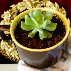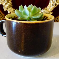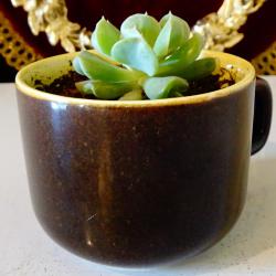 Младо растение Echeveria runionii Topsy Turvy, засадена в стара румънска керамична чашка за кафе. Този сукулент е носител на престижната награда за градински заслуги на Кралското градинарско общество - Великобритания и е избрана за „Растение на месеца“ през октомври 2010 г., от списание The Garden Path. На последната снимка е майчиното растение и реални снимки на цъфтежа.