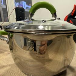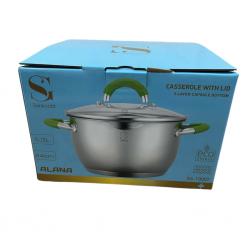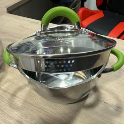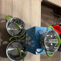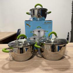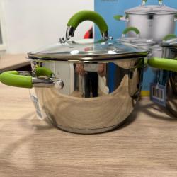 Комплектът тенджери Swissgold Alana е създаден за домакинства, които ценят качественото и равномерно готвене с минимален разход на енергия. Идеален избор за модерни кухни, търсещи издръжливост, стил и функционалност в едно. Характеристики 3 броя тенджери с различен капацитет за гъвкаво приготвяне на разнообразни ястия Висококачествена неръждаема стомана, устойчива на корозия и надраскване 5-слойно капсулно дъно за равномерно разпределение на топлината Стабилни капаци от неръждаема стомана за задържане на аромата и влагата Ергономични, термоустойчиви дръжки за сигурен захват Подходящи за всички видове котлони, включително индукционни Лесно почистване и съвместимост със съдомиялна машина Цвят: Зелени дръжки; Допълнителни функции: Турбо индукция, еко-смарт дизайн за по-бързо готвене; Размери и капацитети на тенджерите: Малка тенджера - 16 × 9.5 см ≈ 1.5 литра Средна тенджера - 18 × 10.5 см ≈ 2.3 литра Голяма тенджера - 20 × 11.5 см ≈ 3.1 литра Доставка с Еконт с преглед. За повече продукти може да ни посетите на адрес: www. stokizavseki. com