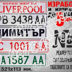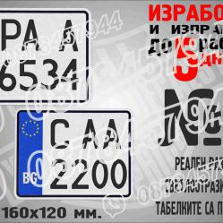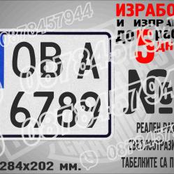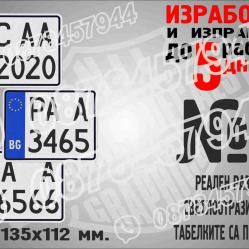 Табела с реален размер, светлоотразителна с име, регистрационен номер, отбор или повод. Представлява чудесна възможност да отбележите празник, да я поставите зад предното стъкло, да обозначите паркомясто, гараж, да подредите местата в автопарка, да подредите селскостопанската техника или строителната механизация в двора, да обозначите мястото на мотоциклета, скутерчето, ремаркето или караваната в общия двор. Лицето на табелите е от фолио и те НЕ са релефни. Табелите в никой случай НЕ ЗАМЕСТВАТ по предназначение регистрационните и ние НЕ носим отговорност при неправилното им използване. Цената е за ЕДИН брой. Табела с основа Еталбонд - 49 лв. Табела с ПВЦ основа - 39 лв. Дебелината е 3 мм. Размерите са: №1-521-113 мм., №2-199-154 мм., №3-160-120 мм., №4-284-202 мм., №5-250-150 мм., №6-135-112 мм.