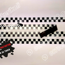 Комплект от 4 бр. ленти с квадратчета за такси напечатани върху качествено ПВЦ фолио с УВ-матов печат устойчив срещу надраскване, избеляване и миене, залепени върху магнитно фолио позволяващо многократното им поставяне и отстраняване. Размерът им е подходящ за автомобили с различна дължина на вратите, като излишната дължина се премахва след монтиране с макетен нож или ножица. Всяка една лента е с дължина 112 см.
