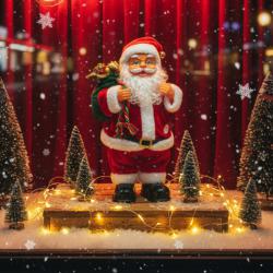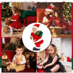 Тип продукт: Електрическа фигура / музикална кукла; Тема: Дядо Коледа; Материал: Плюш, фланела, пластмаса; Цвят: Червен с бели и черни акценти; Размери: 26 × 12 см; Захранване: 3×AA батерии (Не са включени в комплекта); Функции: Танцува и поклаща бедра/Движи глава/Излъчва светлини/Пее коледни мелодии; Управление: Автоматично, чрез бутон за включване; Подходящ за: Домашна декорация, коледни партита, офиси, подаръци за деца;