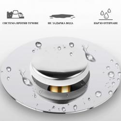 Материал: Неръждаема стомана + месинг; Диаметър на тапата: 6,2 см; Диаметър на стеблото: 0,8 см; Диаметър на уплътнението: 3,3 см; Височина: 5 см; Гумена подложка: Неплъзгаща се за сигурно закрепване; Лесен монтаж: Без инструменти – просто поставете и използвайте.