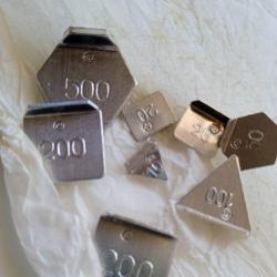 2) Снимка 4 Комплект алюминиеви тежести 8 брой, ново: 10 мг, 20 мг 2 бр., 50 мг, 100 мг, 200 мг 2 бр., 500 мг. Цена 16 лв.