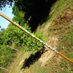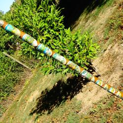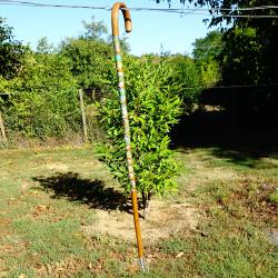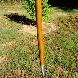 Стар тиролски туристически бастун, ръчно изработен от естествено парено дърво. Декориран с 10 красиви значки, цветни метални апликации от различни туристически дестинации. Завършва с перфектен връх от неръждаема стомана – не го лови магнит. Дължина 77 см., диаметър 2 см.
