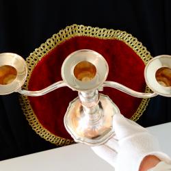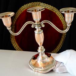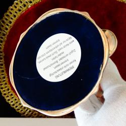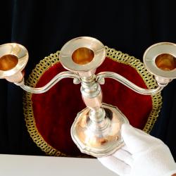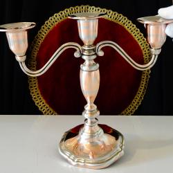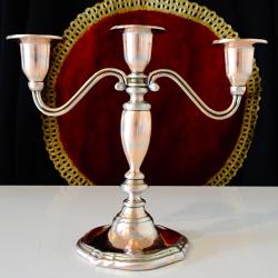 Старинен викториански меден свещник за три свещи, троен свещник, свешник тройка, майсторска ръчна изработка от масивна чиста червена мед. Много стилен, блестящ и ефектен. Основата има меко мастилено синьо кадифе за да не драска мебелите и запазен етикет. Височина 19 см., дължина 22.5 см., диаметър 10 см. Тегло 430 гр.