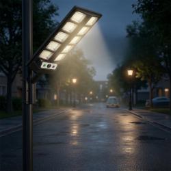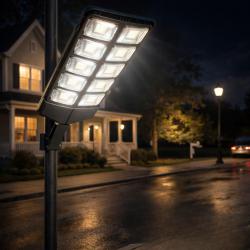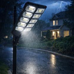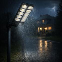 Технически характеристики на Улична соларна лампа BK-260-10 DRAGON 3000W - мощна и икономична Технически данни (резюме): Мощност: 3000W LED секции: 10 Режими: 3 (висок, икономичен, сензор за движение) Сензор: Вграден PIR за движение Дистанционно управление: включено Клас на защита: IP65 (водоустойчив и прахоустойчив) Дължина (със стойка): 64 см; Височина на панела: 43 см; Ширина: 14.2 см Захранване: Соларна енергия (интегрирани панели/батерия) Приложение: Външно осветление за двор, градина, паркинг, пътеки и фасади