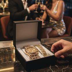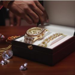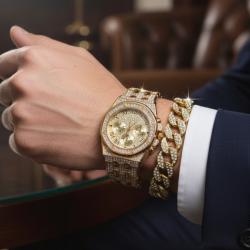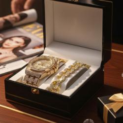 Тип: ръчен часовник за китка + гривна тип верига; Стил: ежедневен / casual, силно декоративен; Форма на корпуса: кръгла; Скала: римски цифри; Елемент/детайли: инкрустирани камъни по корпус, циферблат и верижка; Цвят на каишката/верижката: златист; Материал – корпус/каишка: сплав на цинка; Стъкло: синтетично; Захранване: батерия тип бутон/монета; Водоустойчивост: няма (избягвай контакт с вода, пара и козметика); Комплект: часовник + гривна в същия стил.