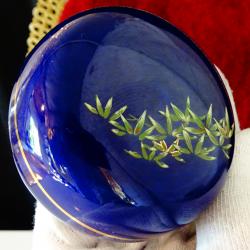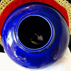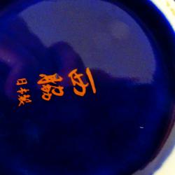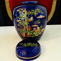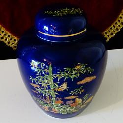Стар японски порцеланов джинджифилов буркан, урна, ваза, японски костен порцелан Nishiwaki, маркиран с печат от производителя. Ръчно рисуван двустранно с красива картина на яребици, сред бамбукови дръвчета и пъстри цветя. Приказна живопис с ярки цветове и много блестящо чисто злато 24 карата. Контрастира ефектно с перфектен мастилено син фон от кобалт. Височина 16 см., диаметър 14 см.