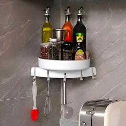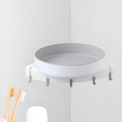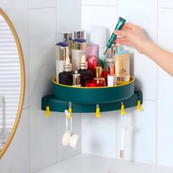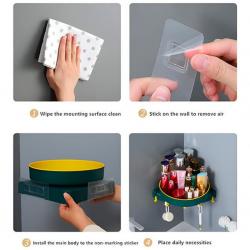 Продукт: Въртяща се ъглова поставка за баня и кухня; Материал: Влагоустойчива пластмаса; Размери: 35 × 26 × 10 см; Тегло: 600 г; Цветове: зелен или бял; Монтаж: без пробиване, с лепящи ленти; Подходяща повърхност: плочки, стени, стъкло, други гладки повърхности; Предназначение: козметика, тоалетни принадлежности, подправки, кухненски аксесоари.
