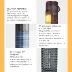 Безопасност: защита от прегряване; 30 сек. отложено изключване; огнеустойчив PP корпус;
