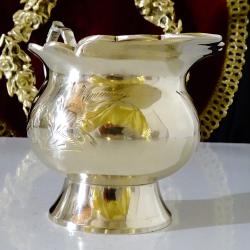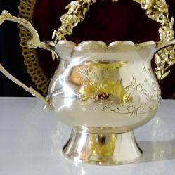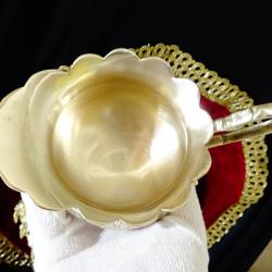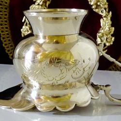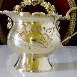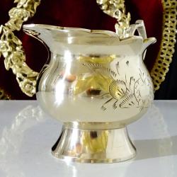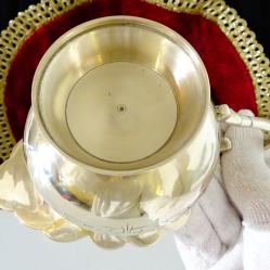 Стара бронзова кана за ракия, каничка за мляко, латиера, майсторска ръчна изработка от масивен високо качествен бронз с ослепителен златен блясък. Декорирана с разкишен релеф и прецизно гравирани орнаменти във викториански стил. Истинско произведение на идкуството – каничка мечта. Височина 10 см., дължина 14.5 см., диаметър 9 см. Тегло 250 гр. Вместимост 200 мл.